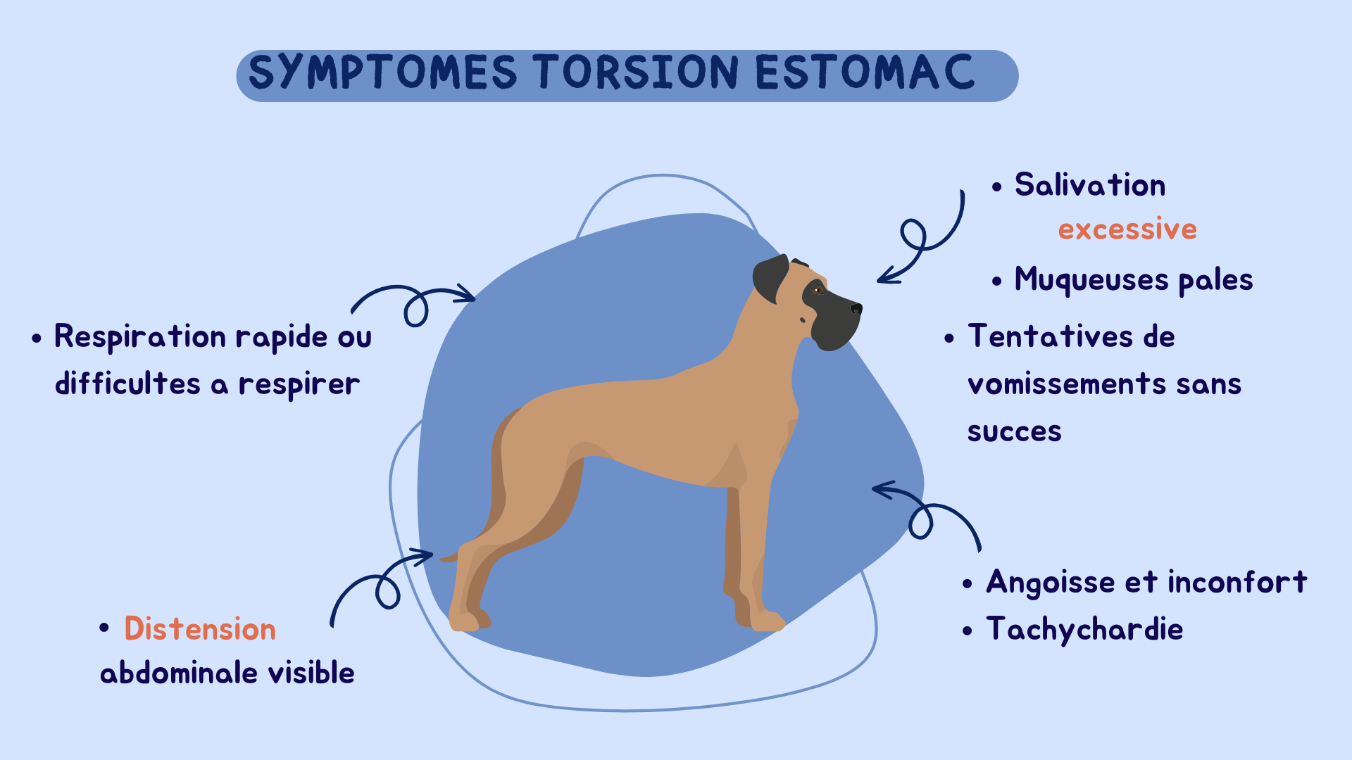 Un chien en SDTE montre principalement une agitation, des nausées et haut-le-coeur avec hypersalivation.