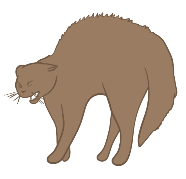 • chat irrité : oreilles généralement tournées sur le côté ou légèrement en arrière, sa queue fouette, il est en position latérale et sur ses appuis.
