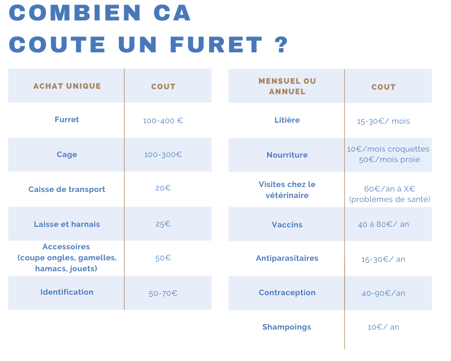 Pour vous aider à vous projeter, voici notre tableau résumant les frais à l'achat et les frais récurrents lorsque l'on possède un furet.