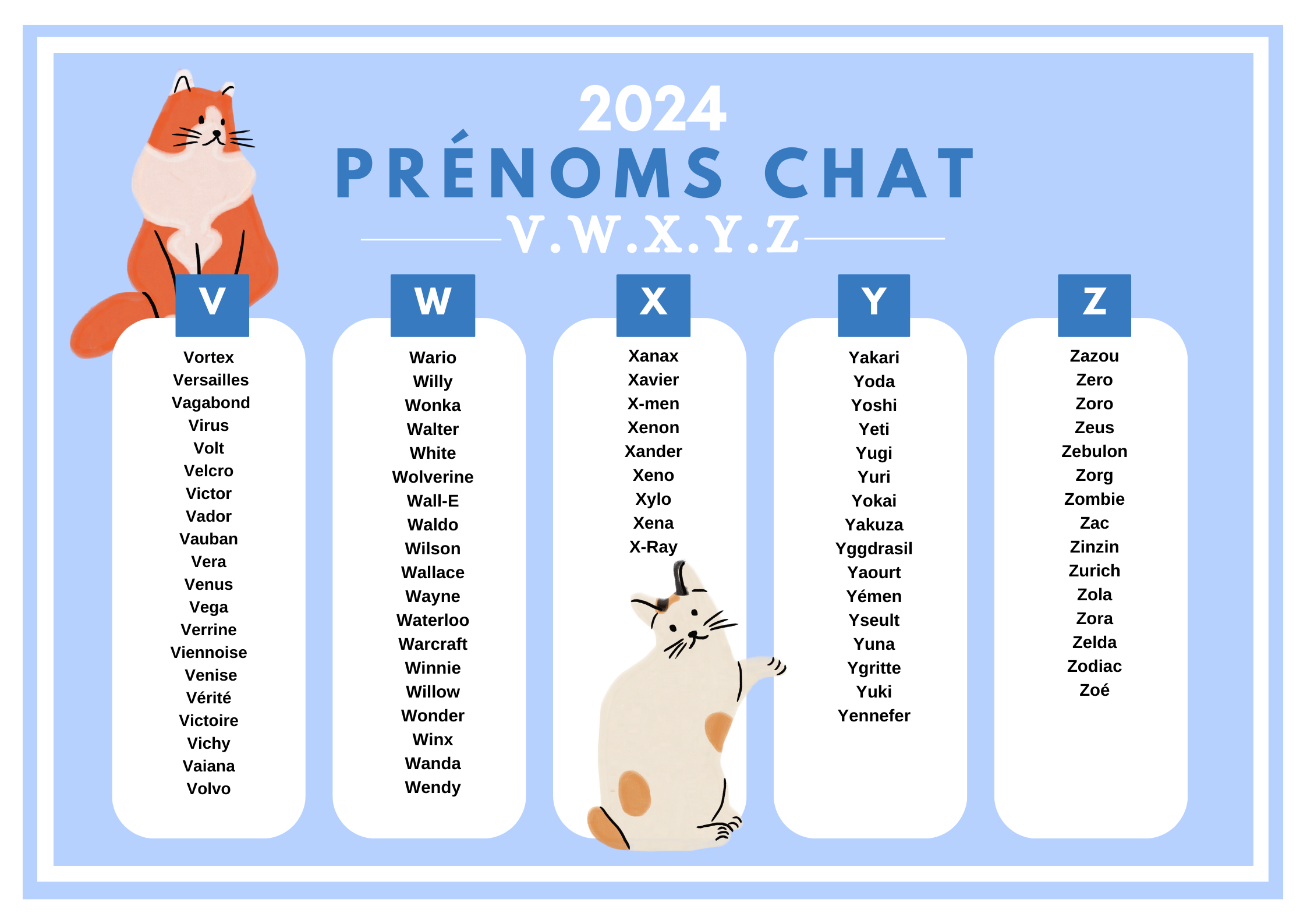2024 est également une année spéciale puisque les propriétaires de chats moins inspirés pourront également choisir un prénom commençant par les lettres W, X, Y et Z !