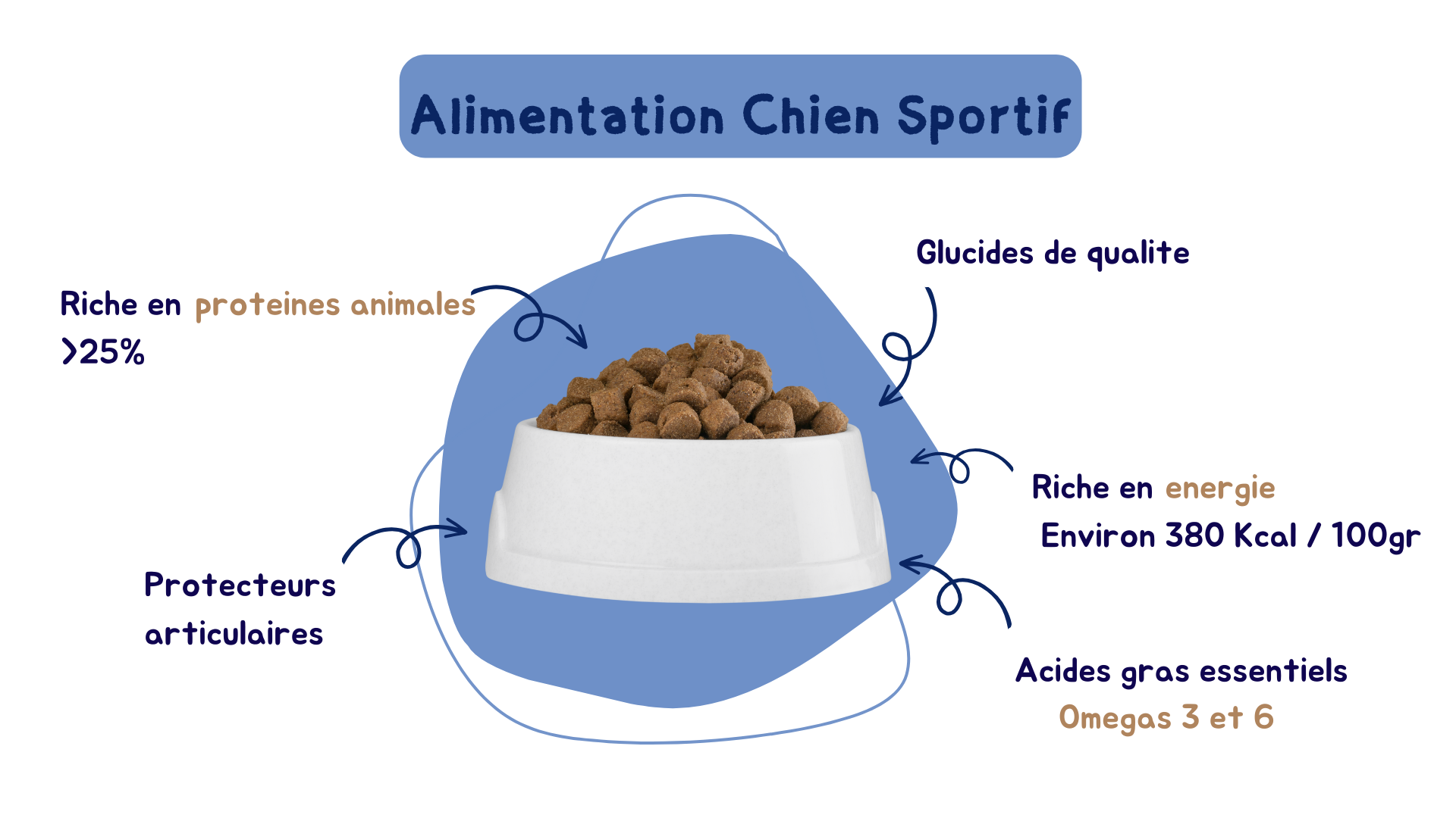Les chiens sportifs ont besoin des mêmes nutriments que leurs homologues, les proportions sont toutefois modulées pour apporter l'énergie nécessaire à une dépense énergétique supérieure.