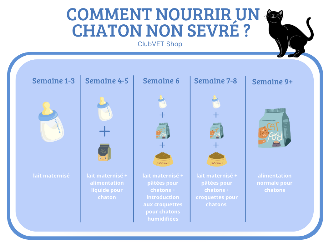 En l'absence de la mère, ou de lactation insuffisante, un substitut de lait spécialement conçu pour les chatons est recommandé, car il contient une composition adaptée aux besoins du chaton.