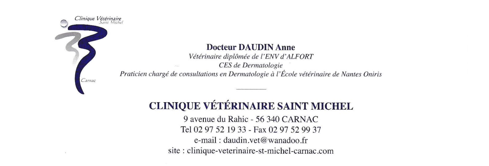 Lettre jointe : Madame Daudin, nous sommes venus à Carnac début octobre pour vous dire au revoir , mais votre confrère était seul à la clinique ce jour-là. Nous avons quitté la Bretagne et la région parisienne pour nous installer dans les Alpes de Haute provence à Gréaux les bains. Nous tenions absolument à vous remercier , pour votre compétence vis à vis de Prince notre setter diabétique ; grâce à vous, il se maintient. Merci de votre écoute , de vos précieux conseils , de votre gentillesse , de votre efficacité ; à chaque visite auprès de vous , nous repartions rassurés. Jamais nous avons trouvé pareil dévouement. Nous vous souhaitons beaucoup de courage, car cela ne doit pas être facile tous les jours. Recevez, Madame Daudin , nos salutations distinguées .