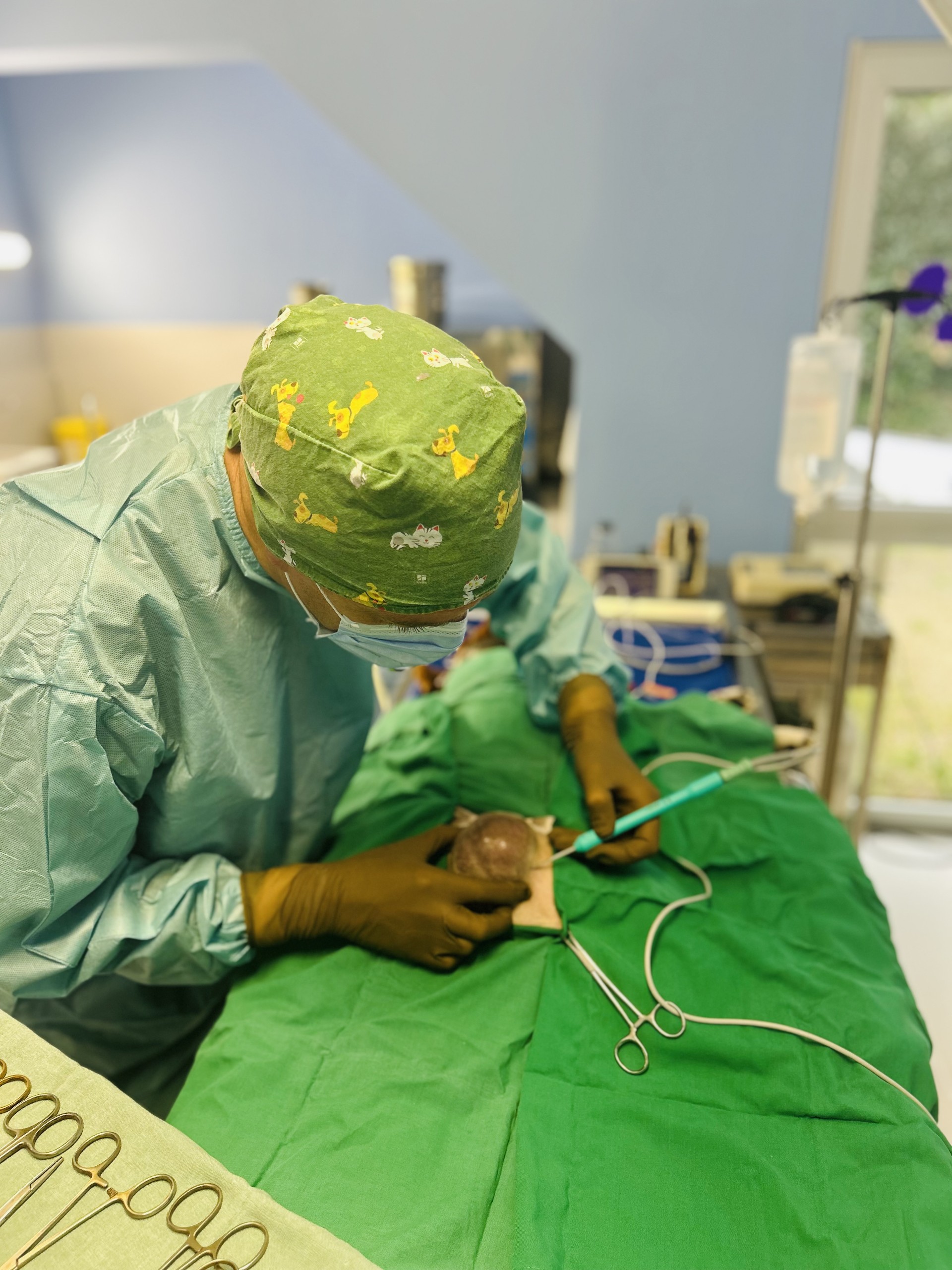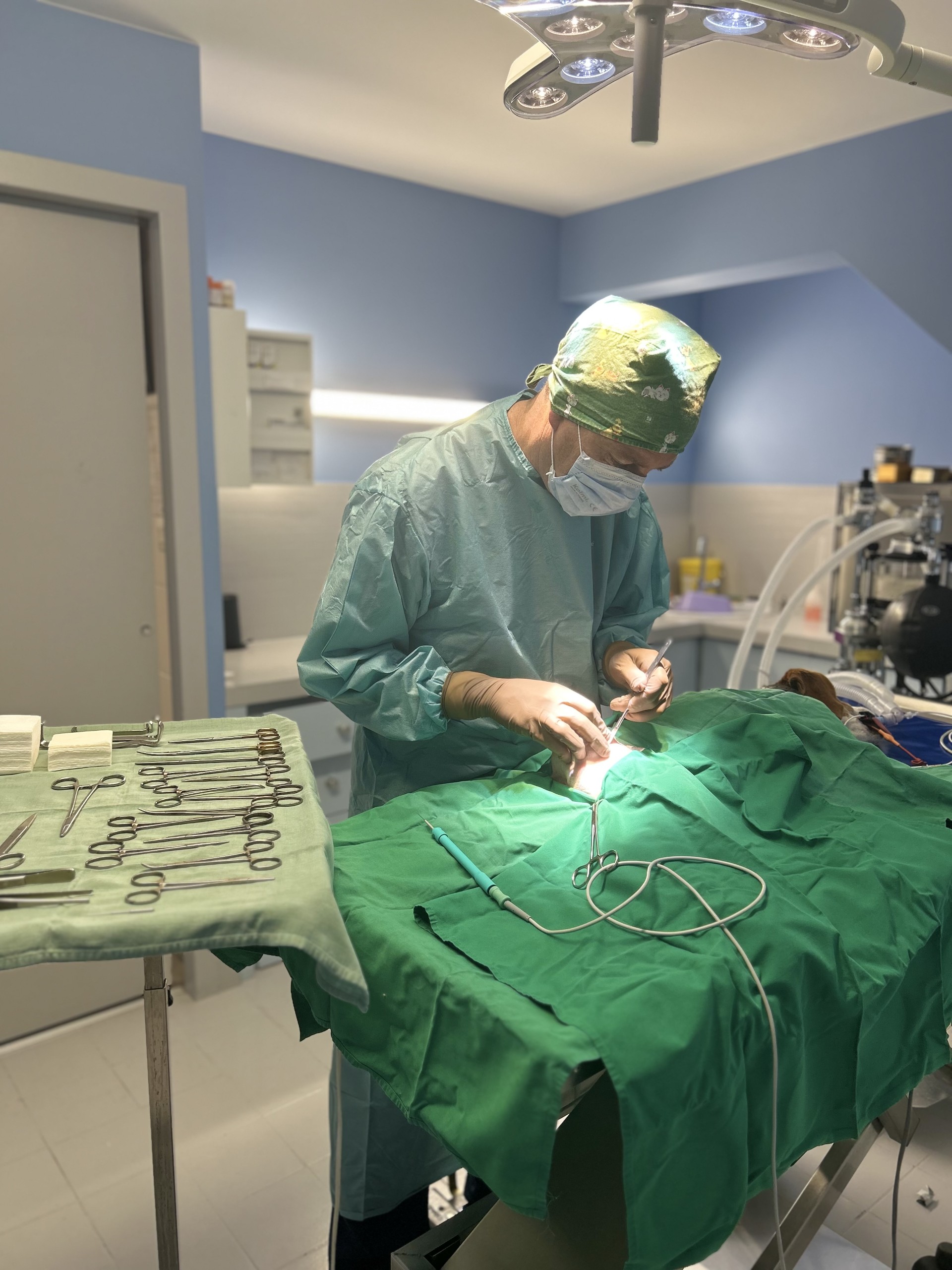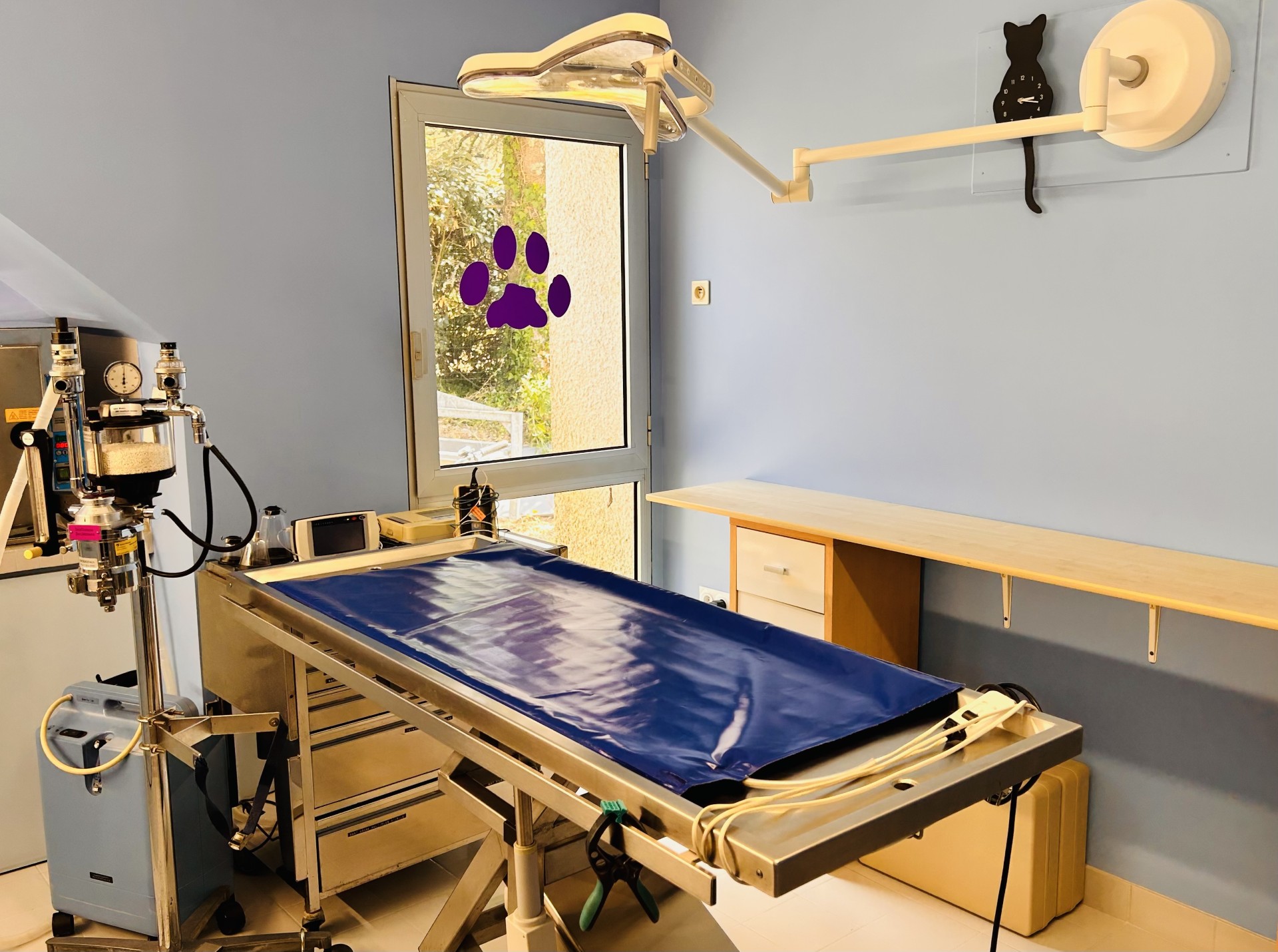 Bloc chirurgical avec anesthésie gazeuse à l'isoflurane, monitoring cardiaque et respiratoire par oxymètre-capnomètre, courbe de capnographie, ECG permanent, tapis chauffant chirurgical. Table à triple oriention.