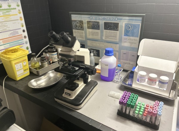 Nous sommes équipés d'un laboratoire d'analyses médicales complet; ces équipements techniques de pointe (laboratoires IDEXX et VIRBAC) permettent un large panel d'analyses sanguines et urinaires